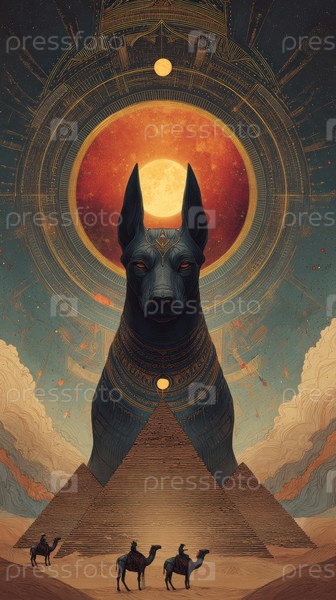 Статуя Анубиса, возвышающаяся над пирамидой, купающаяся в огненном гало и звездной пыли, караван верблюдов во главе с лидером экспедиции, пересекающим песчаные дюны, сюрреалистический