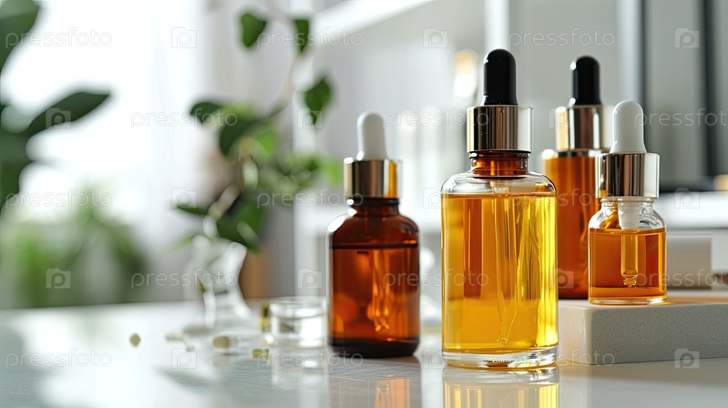 Уход за лицом и стеклянные бутылки сыворотки на белом фоне, концепция ухода за лицом и телом,