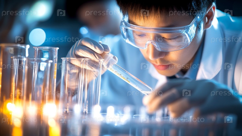 Молодой азиатский ученый в лаборатории, выполняющий точную передачу пипетки, одетый в защитные очки, окруженный подсвеченной посудой и тестовыми решениями,