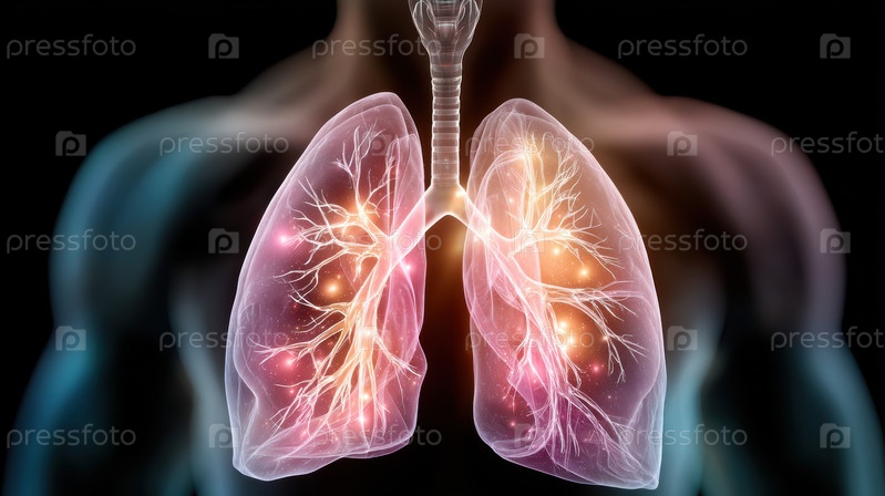 Светящиеся полупрозрачные легкие с цветочными бронхами, цифровая медицинская иллюстрация, смешивающая анатомию и ботанические мотивы, теплые неоновые моменты, отслеживающие альвеолы