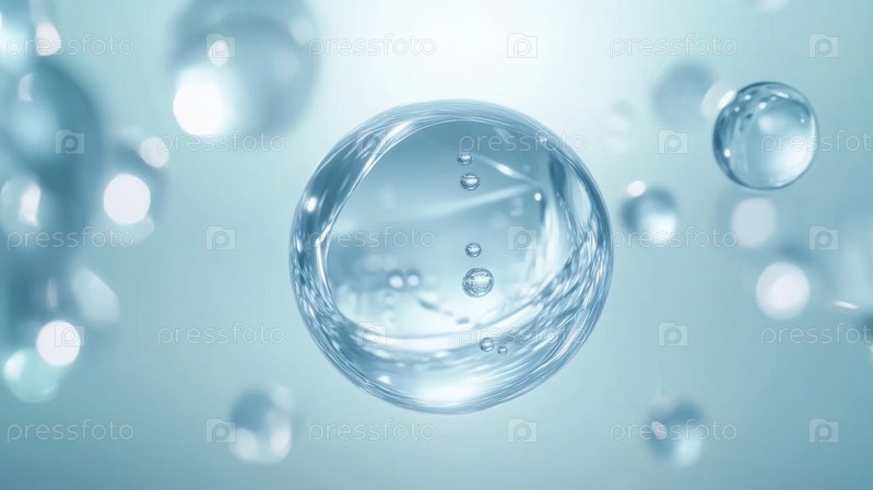 Прозрачные капли воды, плавающие в воздухе, с одной большой каплей, центрированной и окруженной меньшими каплями