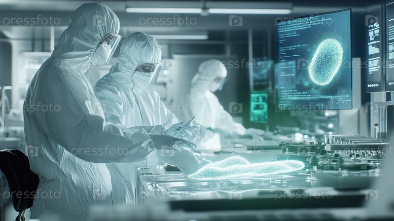 Сцена прорыва в области биотехнологий, ученые в защитных костюмах, анализирующие недавно синтезированные образцы белка в стерильной лаборатории, голографические данные, плавающие вокруг