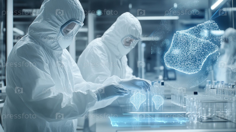 Сцена прорыва в области биотехнологий, ученые в защитных костюмах, анализирующие недавно синтезированные образцы белка