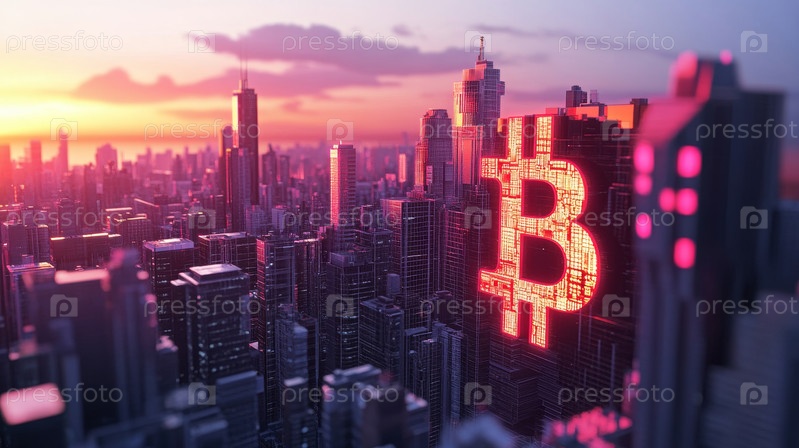 Красочный и яркий городской пейзаж во время сумерек, демонстрирующий массивный символ Биткойна, который ярко освещает горизонт