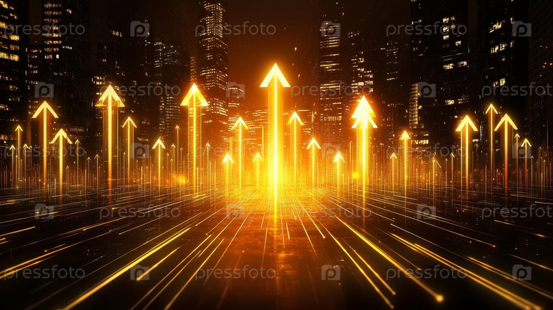 Яркие золотые стрелы иллюстрируют движение вверх и успех в динамичном цифровом ландшафте