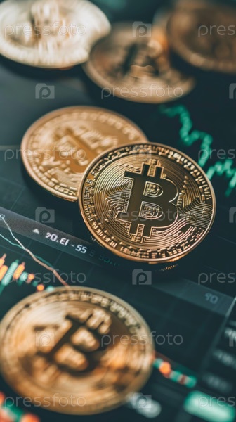 Цифровой торговый дисплей показывает блестящие биткойны и восходящие тенденции, блестящие биткойн-монеты, расположенные на финансовом графике, что указывает на рост рынка и оптимизм инвесторов