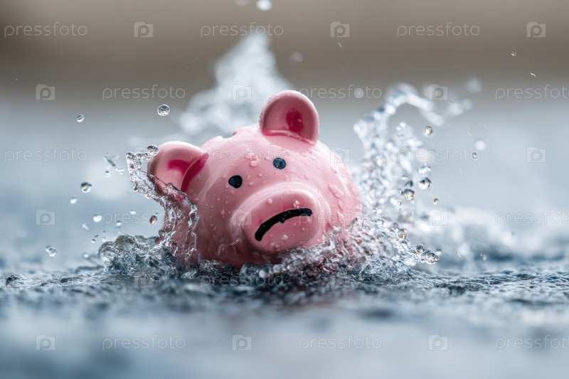 Банк Пигги тонет в долгах, символизируя финансовые перегрузки, личное банкротство