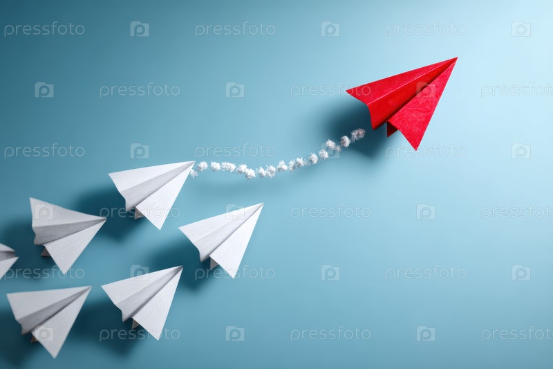 Красный бумажный самолет, ведущий белые самолеты через мягкий синий фон, динамический след крошечных бумажных точек, сильный контраст, символ лидерства, инновации