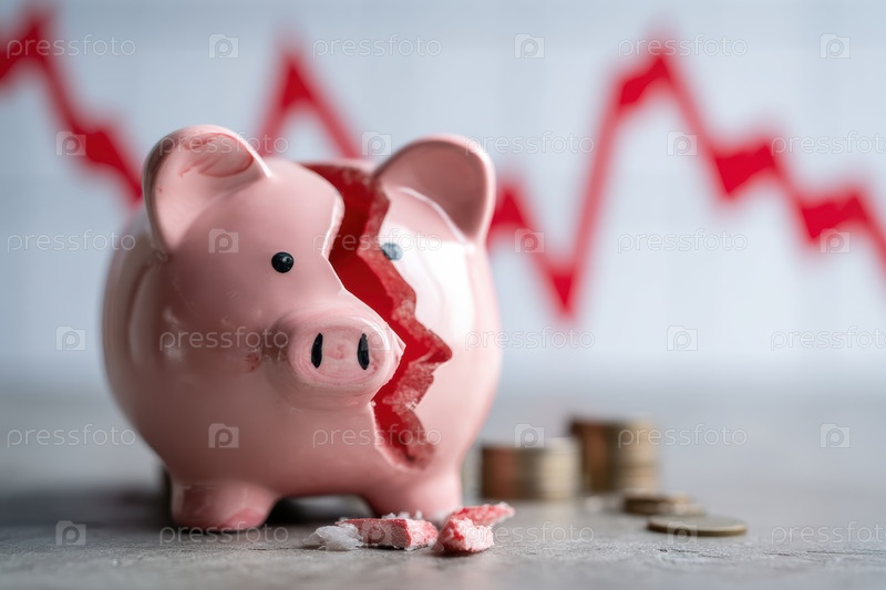 Сломанная копилка на столе, разбросанные монеты, красный график акций, падающий на заднем плане, предприниматель, сталкивающийся с потерей сбережений и бюджетным напряжением, керамические осколки