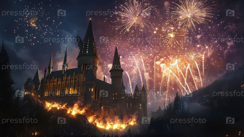 Ослепительные и красочные фейерверки освещают величественный замок, который гордится ярким ночным небом над головой