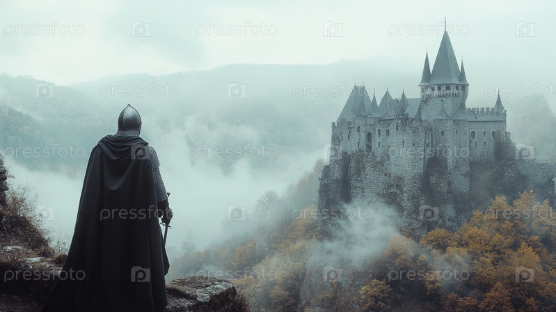 Смелый средневековый рыцарь, полностью одетый в сияющие доспехи, доблестно стоит возле возвышающегося замка, готового к битве