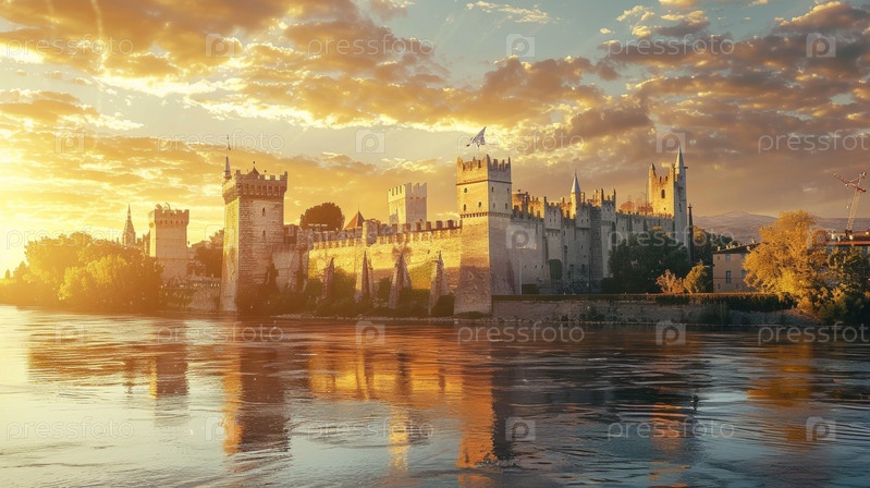 Захватывающий и потрясающий вид на древний замок на закате, красиво отраженный в спокойных речных водах