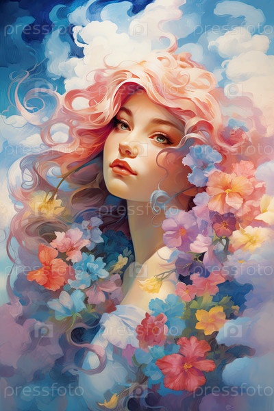 Иллюстрация радуги на гранжевом фоне со снегом и цветочными краями, реалистичный акварельный стиль, розово-голубой