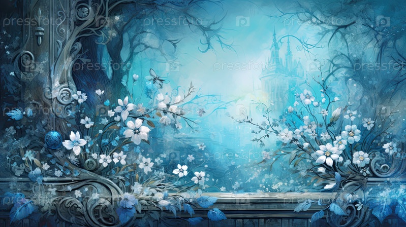 Фантастическая живопись роскошного сада, матовый лазурный синий гранжевый фон с блестящими серебряными металлическими барочными украшениями