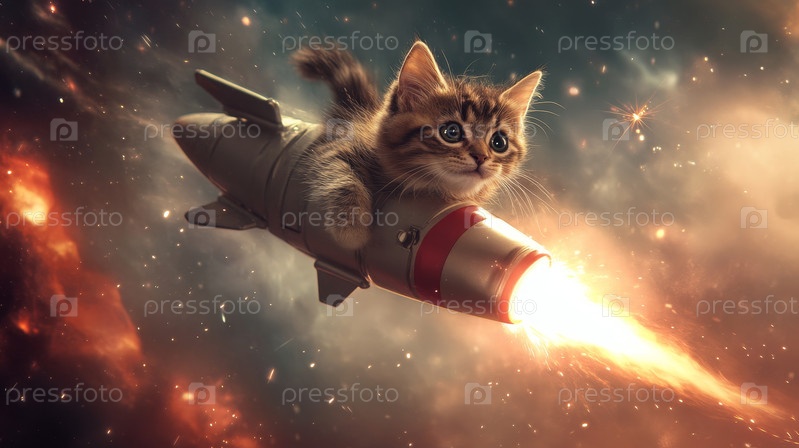Симпатичная кошка радостно ездит на яркой ракете по пушистым облакам, создавая причудливую и образную сцену
