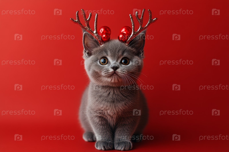Веселая и праздничная кошка в симпатичных оленьих рогах среди красочных праздничных украшений на Рождество