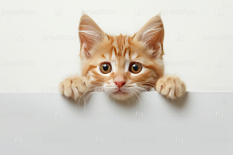 Подглядывающий котенок над белой белой чертежной доской, белый фон