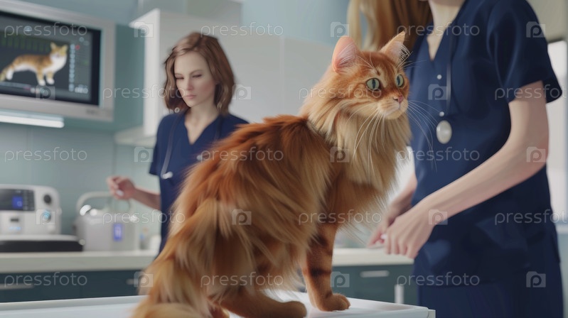 Женщина-врач в синих скрабах исследует оранжевую кошку с длинными волосами