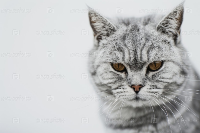 Серебряный британский короткошерстный кот смотрит на камеру, изолированную на белом фоне