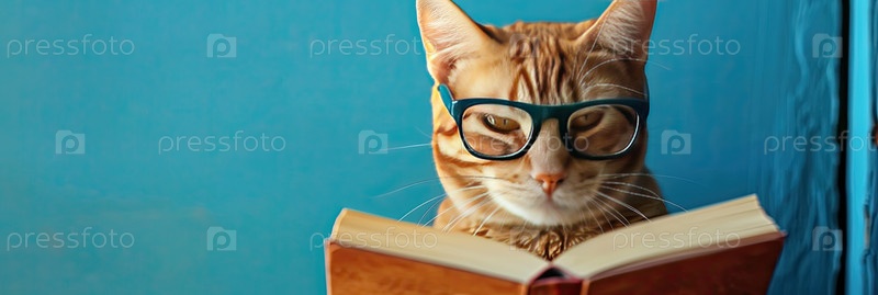 Кошка в очках читает книгу на синем фоне, мы баннер формата