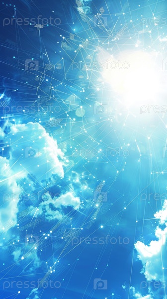 Абстрактные цифровые волны, текущие под ясным голубым небом с облаками, идеально подходят для технологических и инновационных тем