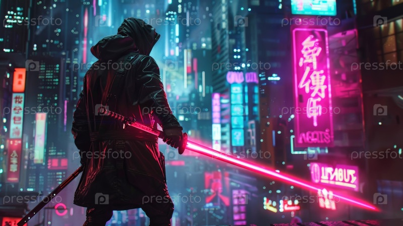 Воин киберпанка стоит в ярком, освещенном неоном городе, захватывая сущность футуристического мира
