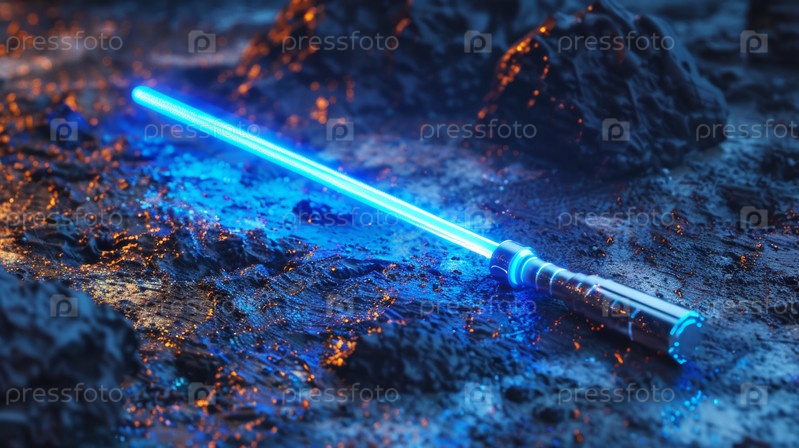 Потрясающий энергетический клинок с синим свечением, покоящийся на текстурированной поверхности, демонстрирующий передовой дизайн и технологии