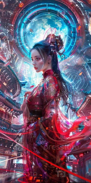 Ориентальная киберпанк-воительница в металлической броне, футуристическая, фэнтези