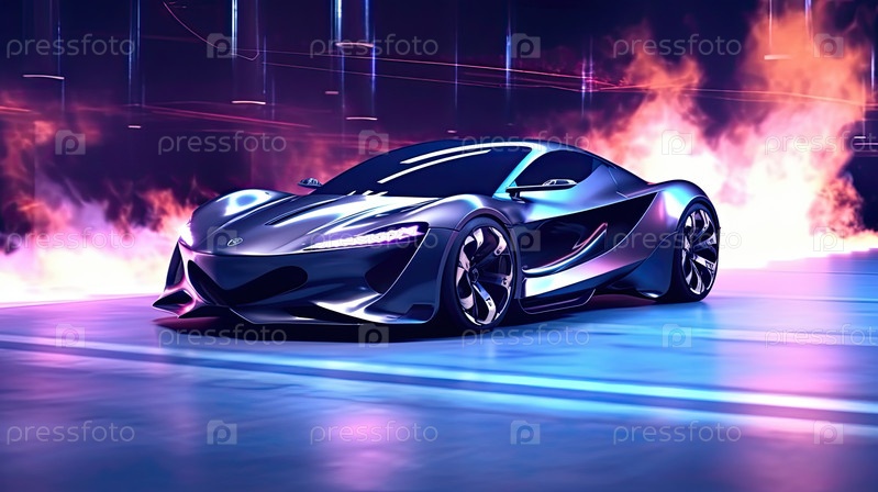 Футуристический спортивный автомобиль, несуществующий дизайн, автомобильная гонка, дефокусированный город в фоновом режиме, 3d иллюстрация