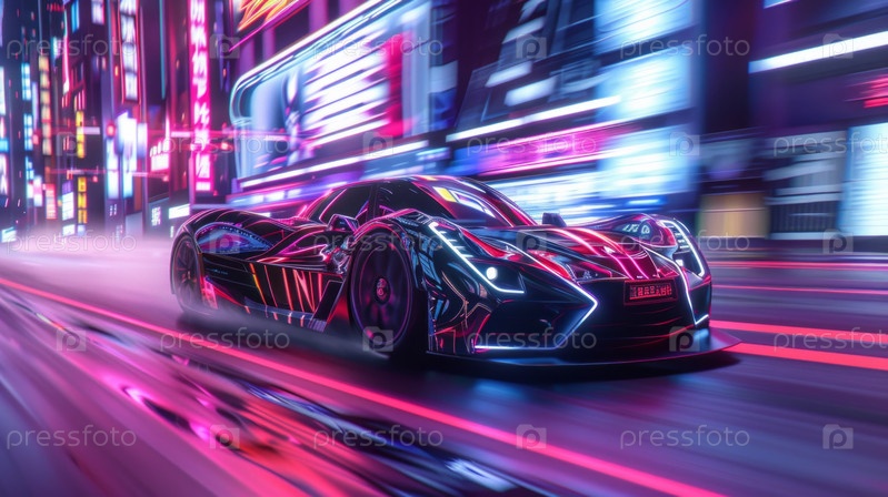 Футуристический спортивный автомобиль, несуществующий дизайн, автомобильная гонка, дефокусированный город на заднем плане,
