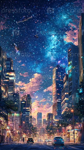 Футуристический город аниме с высокими небоскребами, летающими автомобилями и ярким ночным небом, наполненным звездами