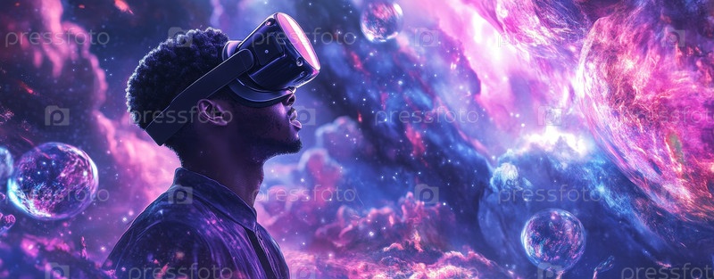 Человек, носящий VR-гарнитуру, с энтузиазмом взаимодействует с потрясающе яркими и красочными цифровыми эффектами