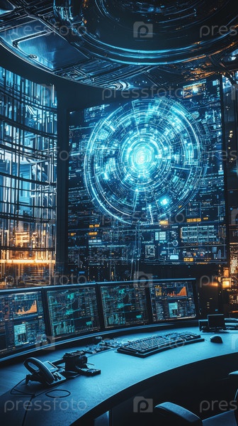 Футуристический кибер-хаб, станция кибербезопасности, освещенная светящимися голубыми акцентами, комната управления с панорамными дисплеями и захватывающей технологической атмосферой