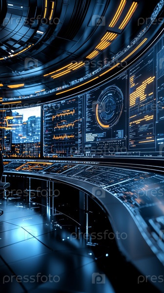 Голографический глобус доминирует в футуристическом командном центре, темный стол управления, купающийся в голубом свете, панорамные экраны отображают топологию сети и матрицы угроз,