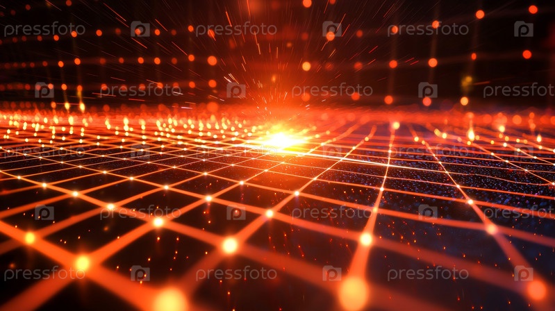 Яркий цифровой ландшафт сетки, блестяще освещенный множеством ярких красных и синих огней
