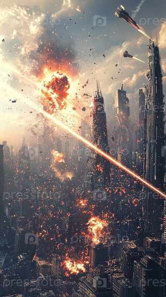 В футуристическом городе, изобилующем взрывным хаосом, пламя танцует среди обломков и передовых высокотехнологичных элементов