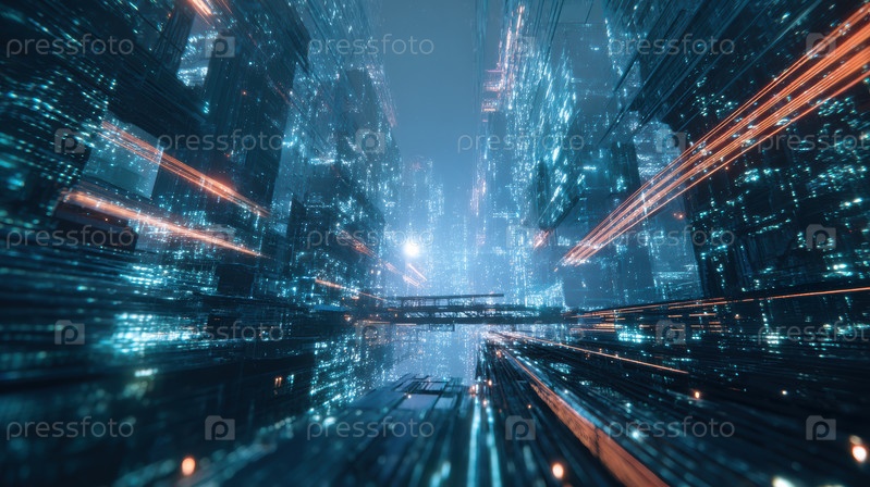 Неоновый коридор данных с каскадными огнями, возвышающимися голографическими структурами, скользкими отражениями и глубокой перспективой исчезающей точки, предполагающей высокую скорость
