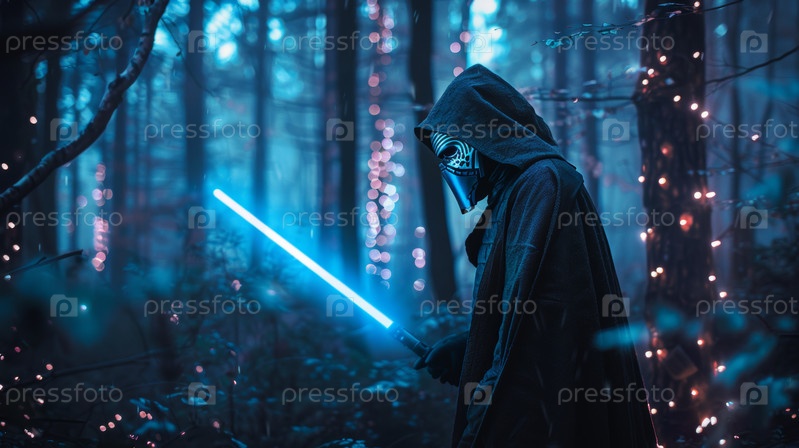 Кавказский воин в капюшоне в лесу, владеющий светящейся саблей под сумеречным навесом, окруженный плавающими искрами и туманом. плащ драпированного сканирования опекуна затененный