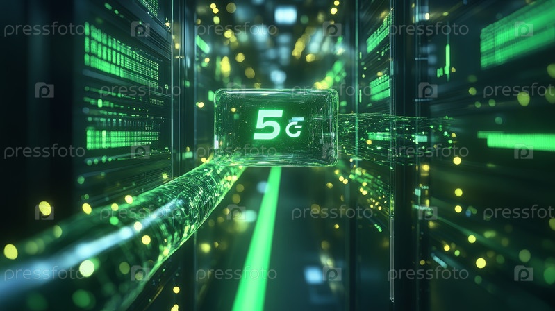 Интерактивная визуализация сети 5G со светящимися потоками данных и яркими цифровыми эффектами