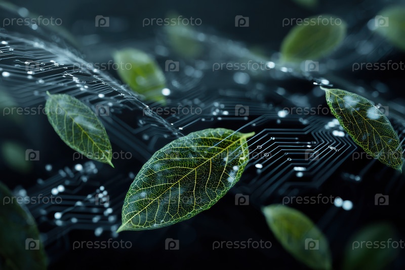 Цифровые листья, плавающие над печатной платой, светящиеся пути передачи данных соединяют наноузлы, имитируя поток возобновляемой энергии и интеллектуальную сенсорную сеть, высококонтрастную