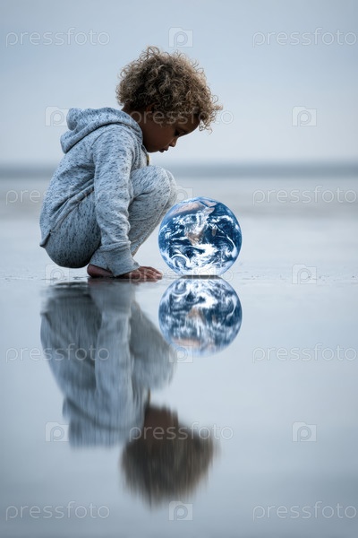 Ребенок на отражающем берегу, исследующий земной шар, вьющиеся волосы, серая толстовка, колени на мокром песке; земная сфера, светящаяся синими континентами; зеркальное отражение