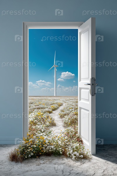 Открытый дверной проем, ведущий к травянистому и цветочному полю с ветряной турбиной