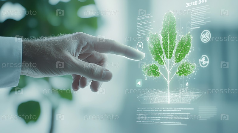 Интерфейс приложения «зеленая энергия» проецируется на стеклянный экран, предприниматель прикасается к голографическому