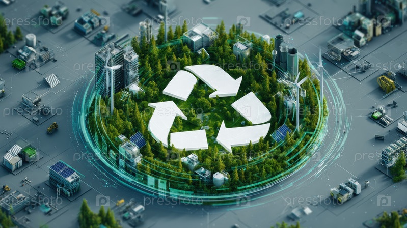 Зеленое кольцо рециркуляции окружает городской горизонт, изображая устойчивую городскую экосистему, сады на крыше, ветряные турбины, солнечные панели, интегрированные среди высотных зданий