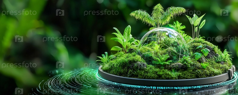 Футуристический голографический интерфейс, окруженный захватывающей природной средой, смешивающей природу и технологии