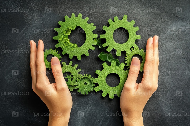 Зеленые шестерни в руках служат мощным символом устойчивости, инноваций и экологически чистых технологий