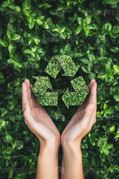 Подчеркивание устойчивости с зеленым символом переработки и руками, окруженными яркими листьями и природой