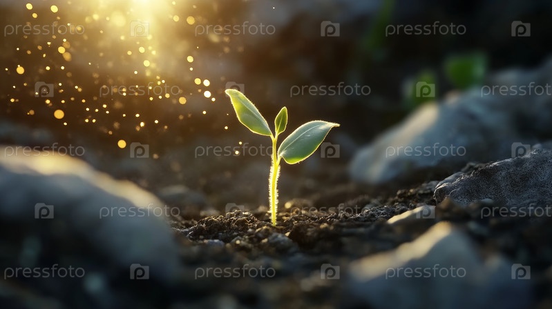 Яркие зеленые саженцы процветают в богатой почве, освещенной мягким солнечным светом, символизирующим обновление природы