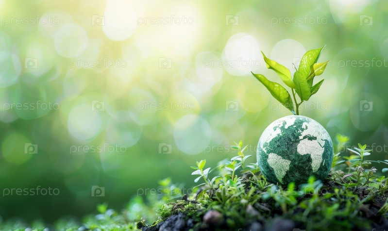 Саженец, прорастающий из земного шара в почве, мягкий солнечный свет боке, росистый мх, покрывающий богатую землю, крошечные зеленые листья, достигающие вверх, символическая экологическая концепция, передающая