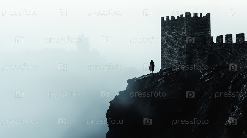 Таинственная и темная фигура зловеще маячит рядом с древним замком, завуалированным в густом тумане, пробуждая любопытство внутри
